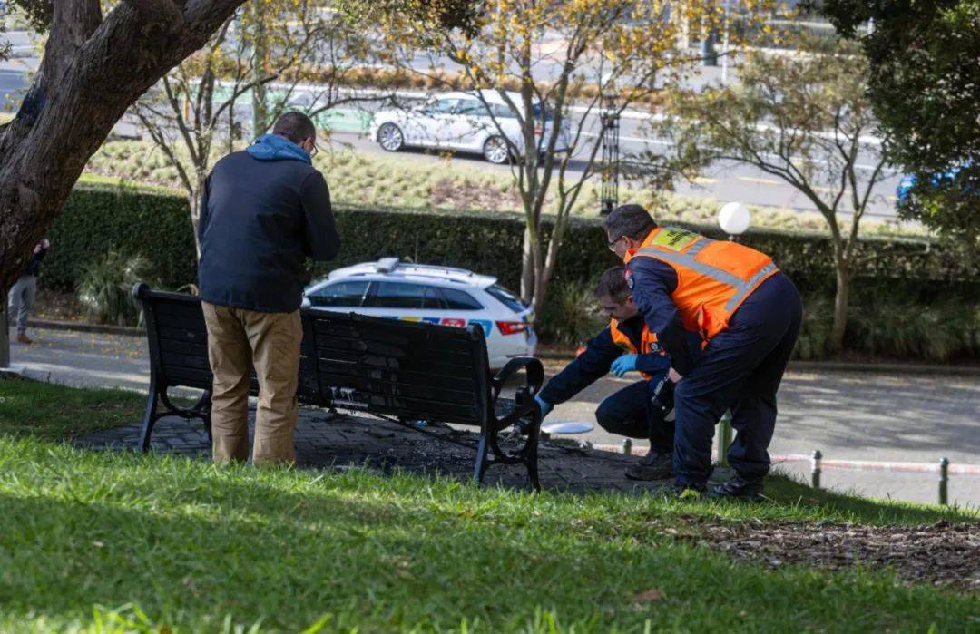 At the scene, a bench showed signs of fire. Smoke could even be seen coming from the bench just before 8am.
