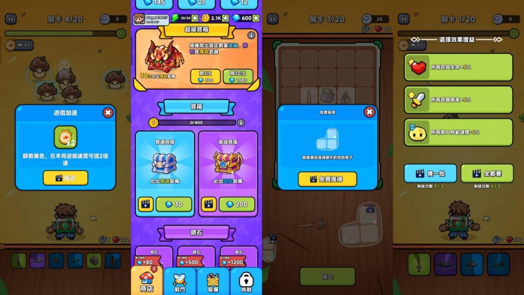 Third, Weapon Master: Backpack Battle, despite its hybrid design and increased depth of commercialization, is still dominated by IAA. The IAP portion is basically store pack purchases, while the IAA portion includes watching ads to get free backpack grids, watching ads in the game to speed up, replacing in-game effect gains, and getting extra sign-up rewards/opening treasure chest times. What's special about Weapon Master: Backpack Battle is that the advertisement acceleration is only for this game (the main level), and although it still takes more than 5 minutes to pass a single game after accelerating, if you don't accelerate, the battle process will be further extended, which can be said that it's a good IAA setup.
