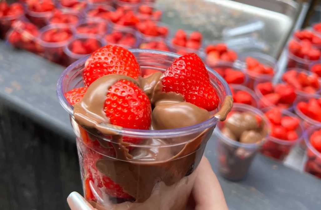 In the entire market, the store with the reddest color is this one. Although it doesn't have a particularly large signboard, the bright red strawberries are very eye-catching. The chocolate cup may look a bit greasy, but in fact, it's not at all. The strawberries are extremely sweet and fresh, and they even burst with juice when you bite into them. The chocolate is also rich and mellow, melting in your mouth.