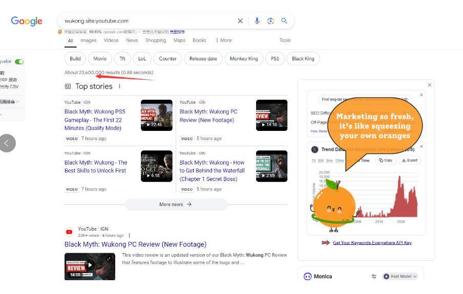 The success of Black Myth: Wukong in the global market cannot be separated from the active promotion and participation of overseas KOLs (Key Opinion Leaders). We can see more than 23M videos when we use the command of wukong site:youtube.com. The following is a detailed discussion of the game's overseas KOL analysis.